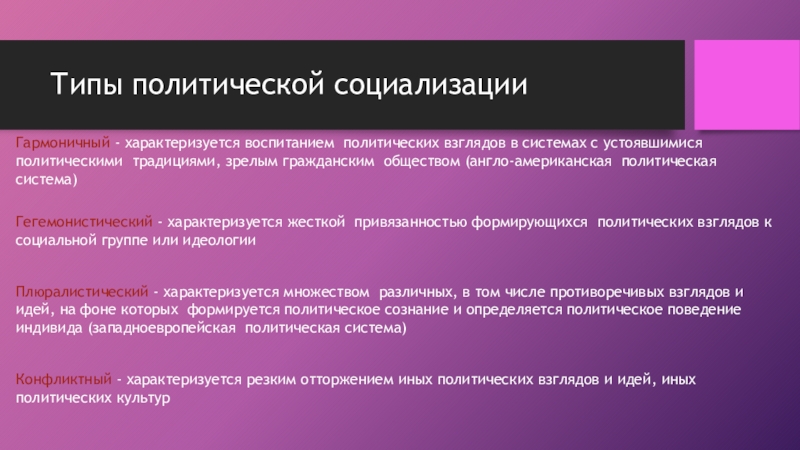 Гегемонистический - характеризуется жесткой привязанностью формирующихся политических взглядов к социальной группе или идеологии