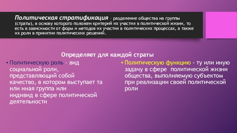 Политическую роль – вид социальной роли, представляющий собой качество, в котором выступает та или иная группа или индивид в сфере политической деятельности