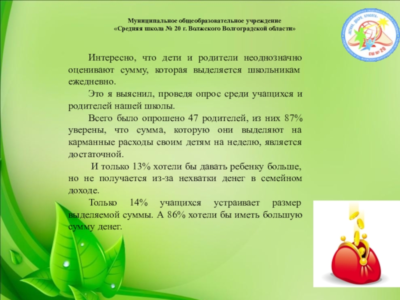 выяснил, что карманные деньги – это мощный инструмент финансового воспитания ребенка, это его самостоятельность и независимость, это возможность выбора. Карманные деньги — это умение подсчитывать и рассчитывать, сберегать и накапливать. Карманные деньги — средства, которые даются подростку родителями на мелкие расходы.