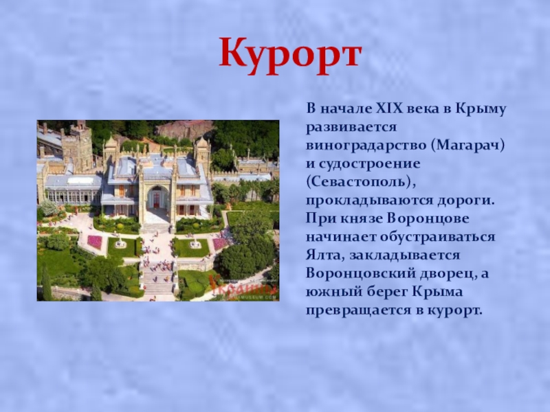 развивается виноградарство (Магарач) и судостроение (Севастополь), прокладываются дороги. При князе Воронцове начинает обустраиваться Ялта, закладывается Воронцовский дворец, а южный берег Крыма превращается в курорт.