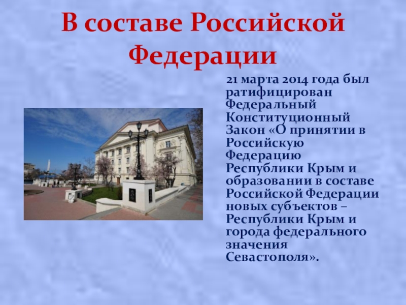 ратифицирован Федеральный Конституционный Закон «О принятии в Российскую Федерацию Республики Крым и образовании в составе Российской Федерации новых субъектов – Республики Крым и города федерального значения Севастополя».