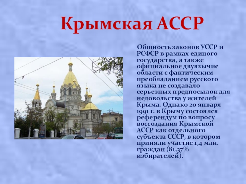 в рамках единого государства, а также официальное двуязычие области с фактическим преобладанием русского языка не создавало серьезных предпосылок для недовольства у жителей Крыма. Однако 20 января 1991 г. в Крыму состоялся референдум по вопросу воссоздания Крымской АССР как отдельного субъекта СССР, в котором приняли участие 1,4 млн. граждан (81,37% избирателей).
