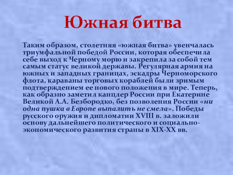 увенчалась триумфальной победой России, которая обеспечила себе выход к Черному морю и закрепила за собой тем самым статус великой державы. Регулярная армия на южных и западных границах, эскадры Черноморского флота, караваны торговых кораблей были зримым подтверждением ее нового положения в мире. Теперь, как образно заметил канцлер России при Екатерине Великой А.А. Безбородко, без позволения России «ни одна пушка в Европе выпалить не смела». Победы русского оружия и дипломатии XVIII в. заложили основу дальнейшего политического и социально-экономического развития страны в XIX-XX вв.