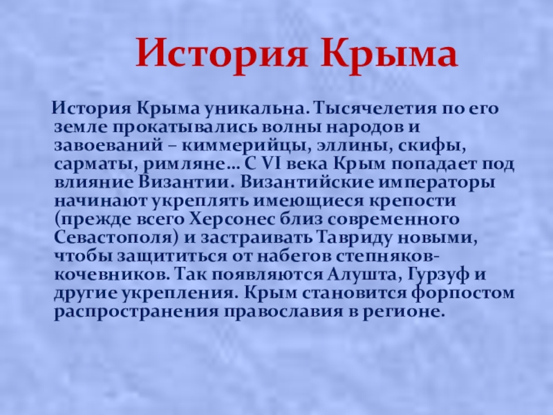 земле прокатывались волны народов и завоеваний – киммерийцы, эллины, скифы, сарматы, римляне… С VI века Крым попадает под влияние Византии. Византийские императоры начинают укреплять имеющиеся крепости (прежде всего Херсонес близ современного Севастополя) и застраивать Тавриду новыми, чтобы защититься от набегов степняков-кочевников. Так появляются Алушта, Гурзуф и другие укрепления. Крым становится форпостом распространения православия в регионе.