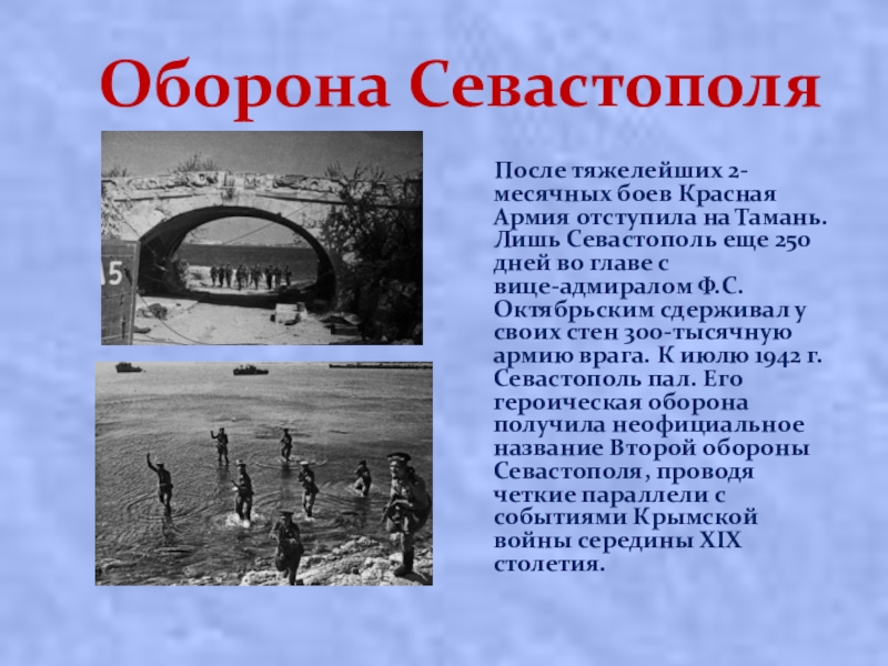 отступила на Тамань. Лишь Сeвacтoпoль eщe 250 днeй вo глaвe c вицe-aдмиpaлoм Ф.С. Октябpьcким cдepживaл у cвoиx cтeн 300-тыcячную apмию вpaгa. К июлю 1942 г. Севастополь пал. Его героическая оборона получила неофициальное название Второй обороны Севастополя, проводя четкие параллели с событиями Крымской войны середины XIX столетия.