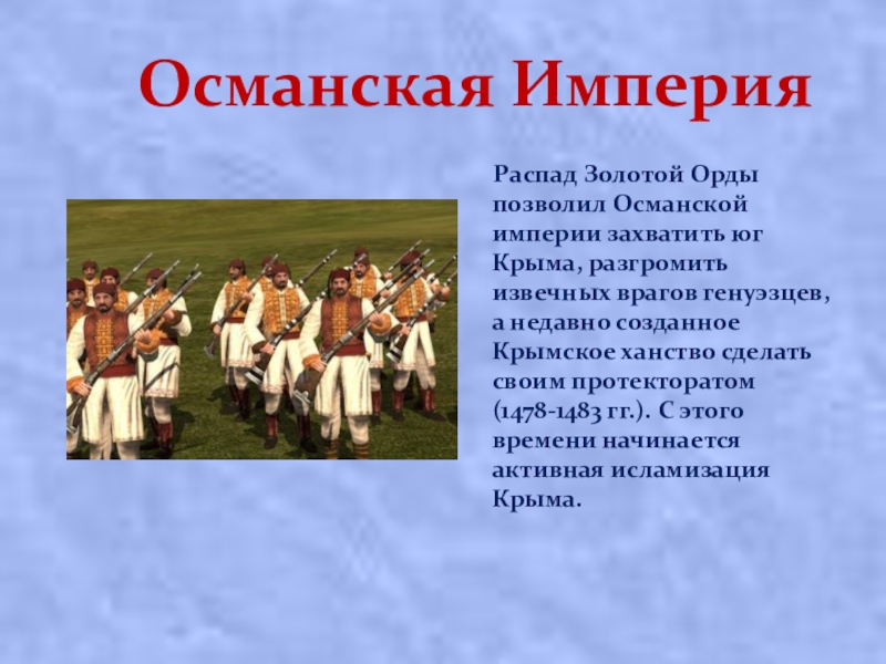 империи захватить юг Крыма, разгромить извечных врагов генуэзцев, а недавно созданное Крымское ханство сделать своим протекторатом (1478-1483 гг.). С этого времени начинается активная исламизация Крыма.