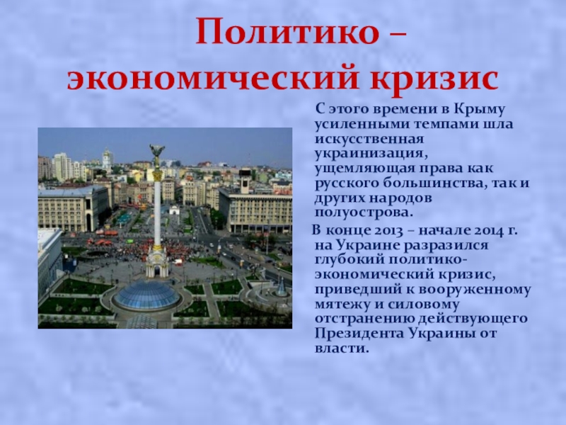 В конце 2013 – начале 2014 г. на Украине разразился глубокий политико-экономический кризис, приведший к вооруженному мятежу и силовому отстранению действующего Президента Украины от власти.