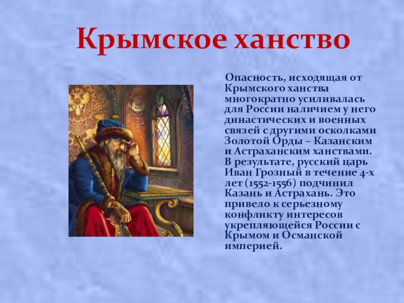 многократно усиливалась для России наличием у него династических и военных связей с другими осколками Золотой Орды – Казанским и Астраханским ханствами. В результате, русский царь Иван Грозный в течение 4-х лет (1552-1556) подчинил Казань и Астрахань. Это привело к серьезному конфликту интересов укрепляющейся России с Крымом и Османской империей.