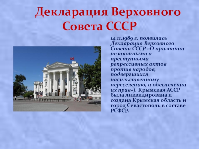 появилась Декларация Верховного Совета СССР «О признании незаконными и преступными репрессивных актов против народов, подвергшихся насильственному переселению, и обеспечении их прав»). Крымская АССР была ликвидирована и создана Крымская область и город Севастополь в составе РСФСР.