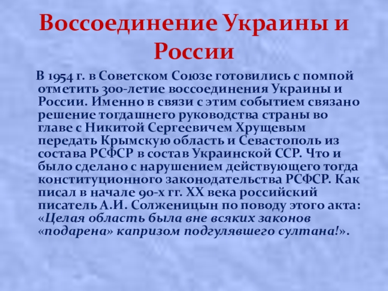 готовились с помпой отметить 300-летие воссоединения Украины и России. Именно в связи с этим событием связано решение тогдашнего руководства страны во главе с Никитой Сергеевичем Хрущевым передать Крымскую область и Севастополь из состава РСФСР в состав Украинской ССР. Что и было сделано с нарушением действующего тогда конституционного законодательства РСФСР. Как писал в начале 90-х гг. ХХ века российский писатель А.И. Солженицын по поводу этого акта: «Целая область была вне всяких законов «подарена» капризом подгулявшего султана!».