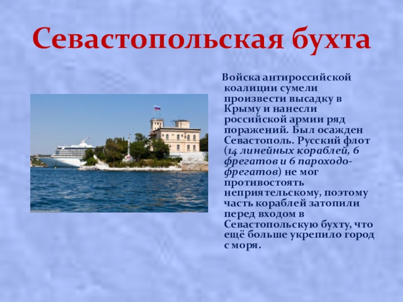 Крыму и нанесли российской армии ряд поражений. Был осажден Севастополь. Русский флот (14 линейных кораблей, 6 фрегатов и 6 пароходо-фрегатов) не мог противостоять неприятельскому, поэтому часть кораблей затопили перед входом в Севастопольскую бухту, что ещё больше укрепило город с моря.