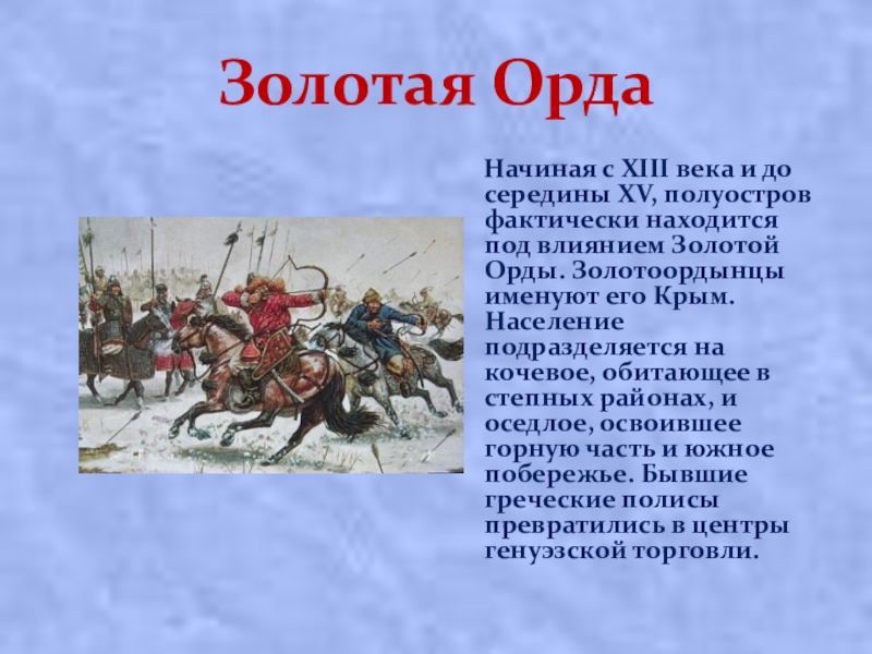 XV, полуостров фактически находится под влиянием Золотой Орды. Золотоордынцы именуют его Крым. Население подразделяется на кочевое, обитающее в степных районах, и оседлое, освоившее горную часть и южное побережье. Бывшие греческие полисы превратились в центры генуэзской торговли.