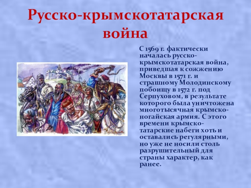 приведшая к сожжению Москвы в 1571 г. и страшному Молодинскому побоищу в 1572 г. под Серпуховом, в результате которого была уничтожена многотысячная крымско-ногайская армия. С этого времени крымско-татарские набеги хоть и оставались регулярными, но уже не носили столь разрушительный для страны характер, как ранее.
