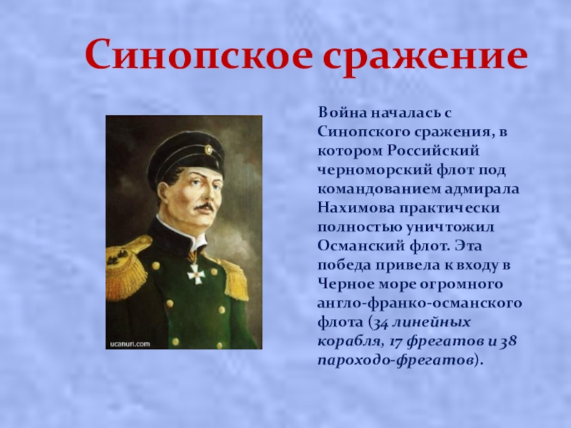 в котором Российский черноморский флот под командованием адмирала Нахимова практически полностью уничтожил Османский флот. Эта победа привела к входу в Черное море огромного англо-франко-османского флота (34 линейных корабля, 17 фрегатов и 38 пароходо-фрегатов).