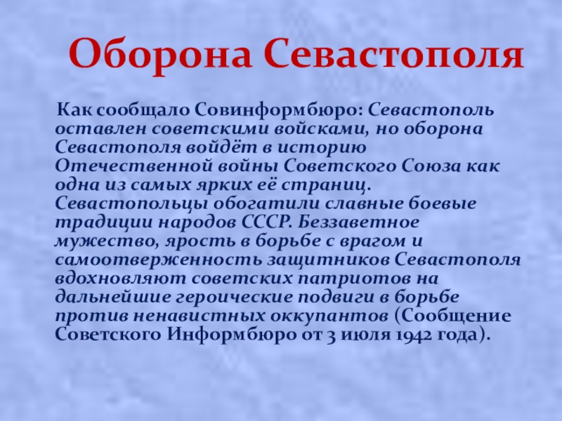 советскими войсками, но оборона Севастополя войдёт в историю Отечественной войны Советского Союза как одна из самых ярких её страниц. Севастопольцы обогатили славные боевые традиции народов СССР. Беззаветное мужество, ярость в борьбе с врагом и самоотверженность защитников Севастополя вдохновляют советских патриотов на дальнейшие героические подвиги в борьбе против ненавистных оккупантов (Сообщение Советского Информбюро от 3 июля 1942 года).