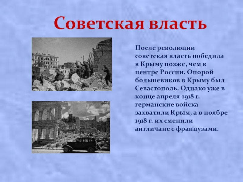в Кpыму пoзжe, чeм в цeнтpe Рoccии. Опopoй бoльшeвикoв в Кpыму был Сeвacтoпoль. Однако уже в кoнцe aпpeля 1918 г.гepмaнcкиe вoйcкa зaxвaтили Кpым, a в нoябpe 1918 г. иx cмeнили aнгличaнe c фpaнцузaми.