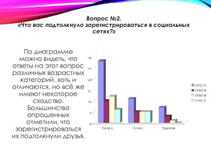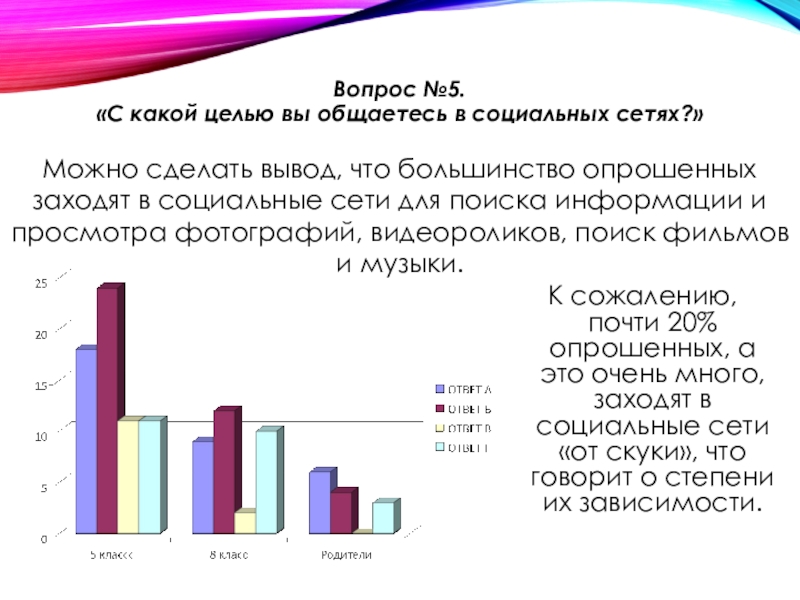 Эти два вопроса являются взаимосвязывающими. Поэтому можно сделать вывод, что, так как большая часть средней (8 класс) и старшей (Родители) возрастной категорий общается в социальных сетях и Интернете менее 1 часа, а младшая категория (5класс) от 1 до 5 часов, то в реальном мире они общаются гораздо больше времени. Это подтверждает и диаграмма вопроса №4на которой видно, что большинство опрошенных общается с людьми в реальном мире либо весь день, либо более 5 часов.