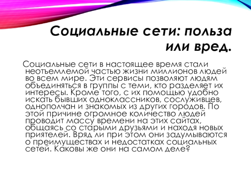 Недостатки данных сервисов являются не чем иным, как обратной стороной их достоинств. Так, все знают, что социальные сети являются удобными платформами для разностороннего общения. Однако, многие настолько погружаются в это общение, что не замечают ничего вокруг. Целыми днями они просиживают на любимых сайтах, постоянно просматривая страницы друзей и обмениваясь сообщениями с ними. Работа и учеба при этом нередко уходят на второй план, ведь они гораздо менее интересны, чем возможность неотрывно следить за жизнью друзей.