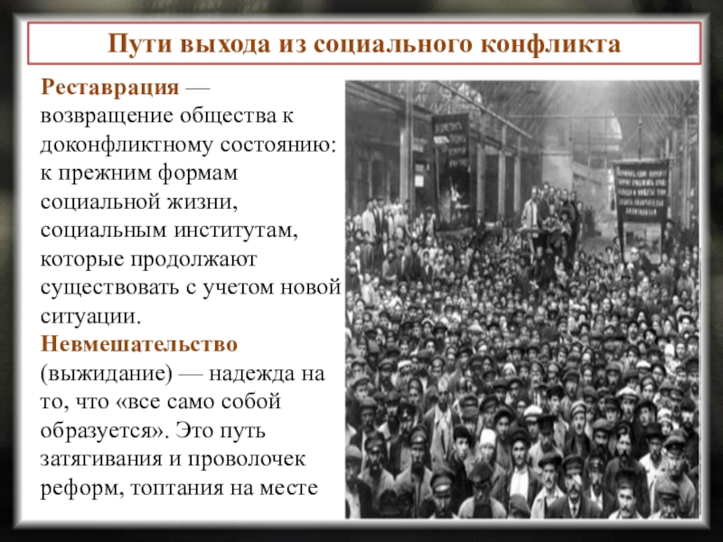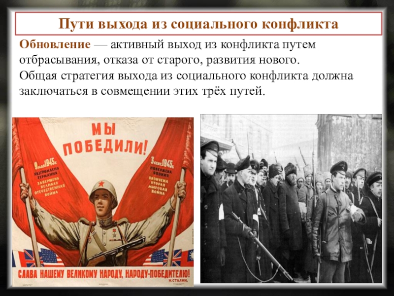Общая стратегия выхода из социального конфликта должна заключаться в совмещении этих трёх путей.