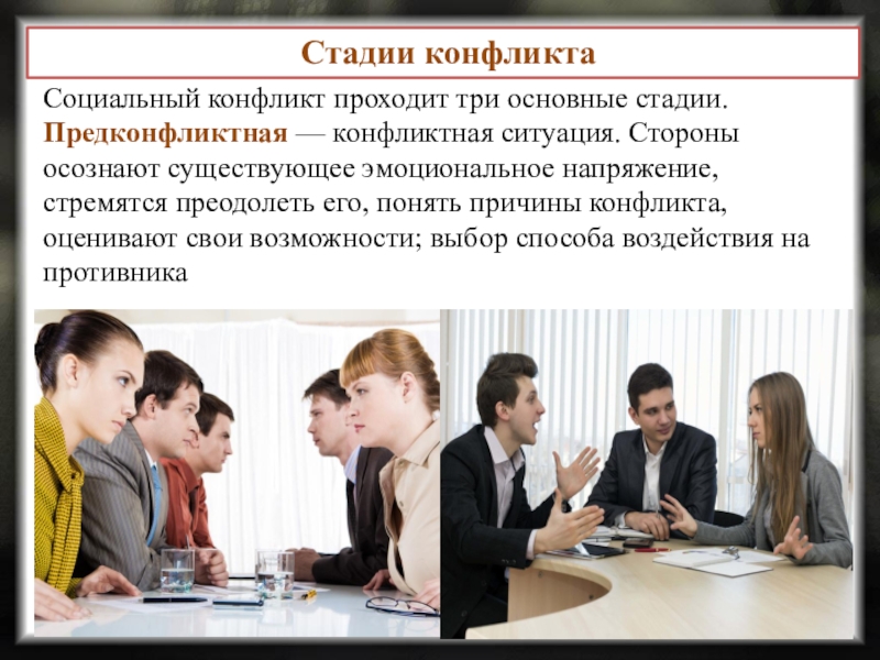 Стороны осознают существующее эмоциональное напряжение, стремятся преодолеть его, понять причины конфликта, оценивают свои возможности; выбор способа воздействия на противника