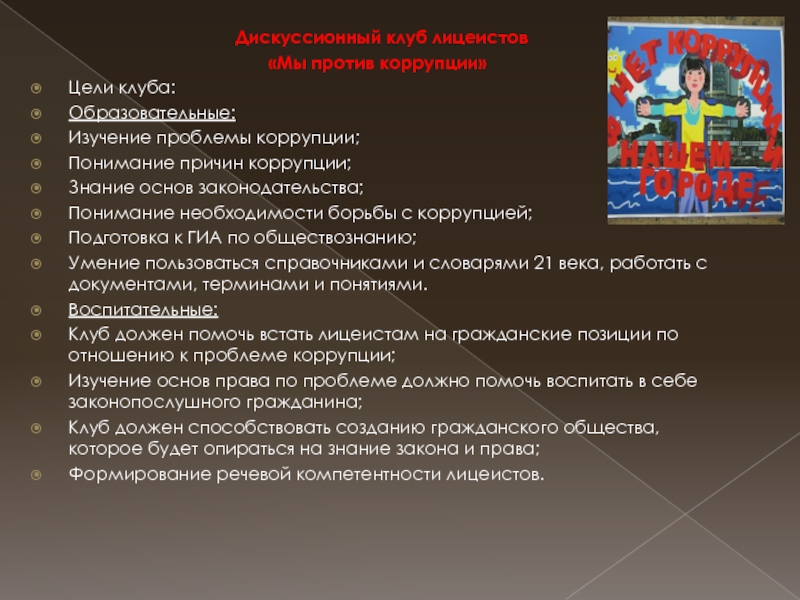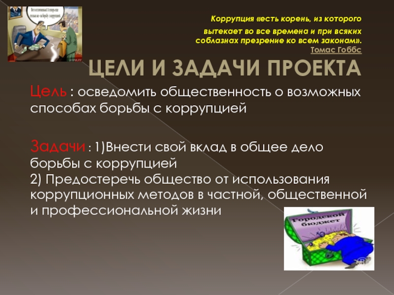 Задачи : 1)Внести свой вклад в общее дело борьбы с коррупцией