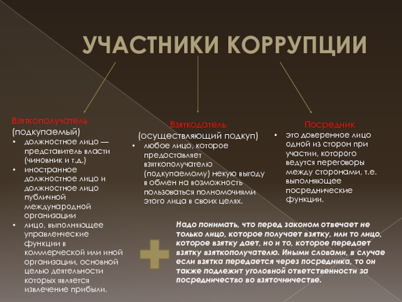 Надо понимать, что перед законом отвечает не только лицо, которое получает взятку, или то лицо, которое взятку дает, но и то, которое передает взятку взяткополучателю. Иными словами, в случае если взятка передается через посредника, то он также подлежит уголовной ответственности за посредничество во взяточничестве.