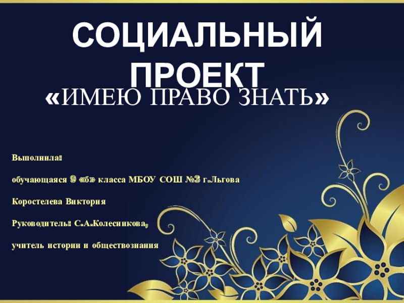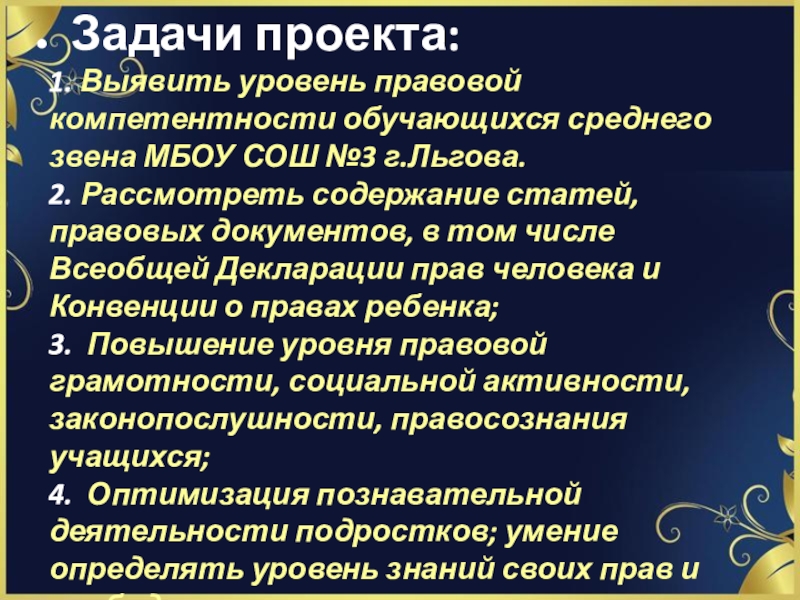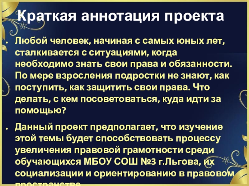 Данный проект предполагает, что изучение этой темы будет способствовать процессу увеличения правовой грамотности среди обучающихся МБОУ СОШ №3 г.Льгова, их социализации и ориентированию в правовом пространстве