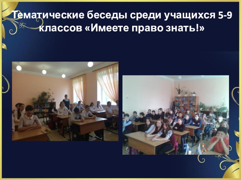 Слайд 17Тематические беседы среди учащихся 5-9 классов «Имеете право знать!»