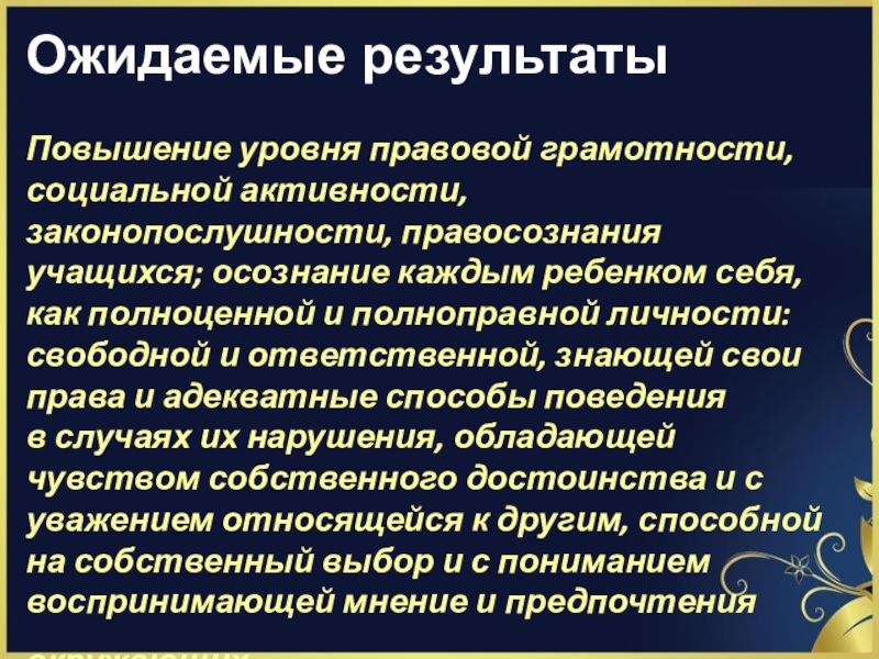 Повышение уровня правовой грамотности, социальной активности, законопослушности, правосознания учащихся;
