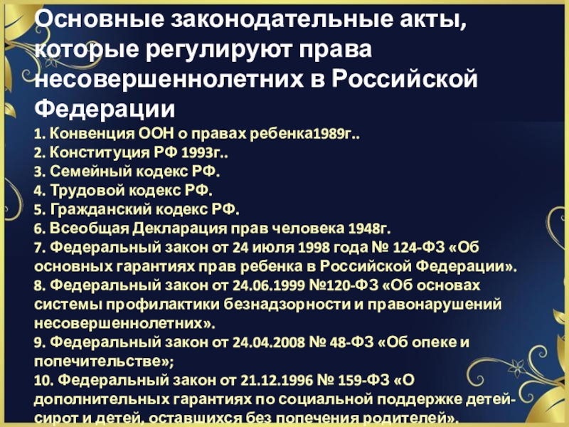 Слайд 8Основные законодательные акты, которые регулируют права несовершеннолетних в Российской Федерации