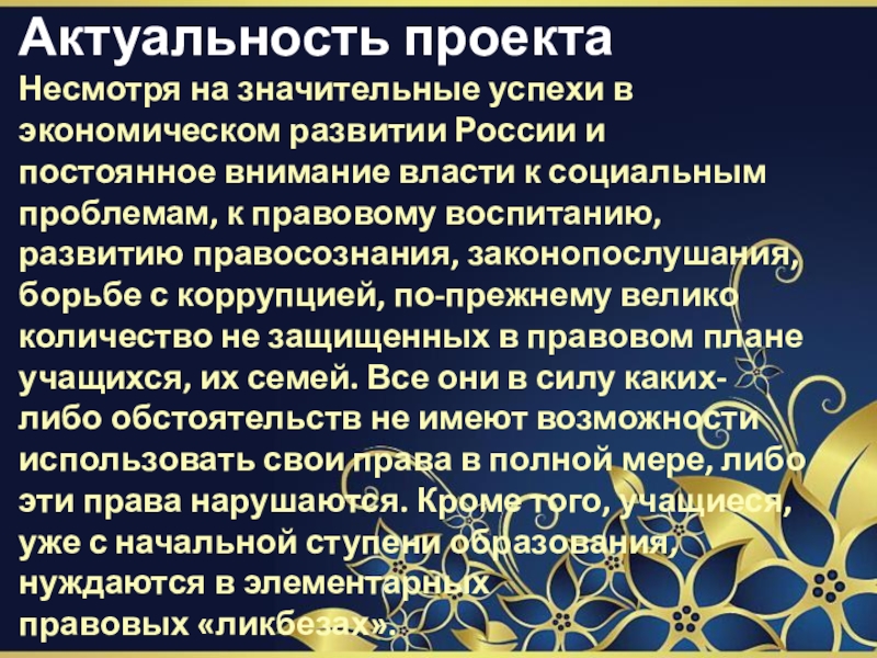 внимание власти к социальным проблемам, к правовому воспитанию, развитию правосознания, законопослушания, борьбе с коррупцией, по-прежнему велико количество не защищенных в правовом плане учащихся, их семей. Все они в силу каких-либо обстоятельств не имеют возможности использовать свои права в полной мере, либо эти права нарушаются. Кроме того, учащиеся,