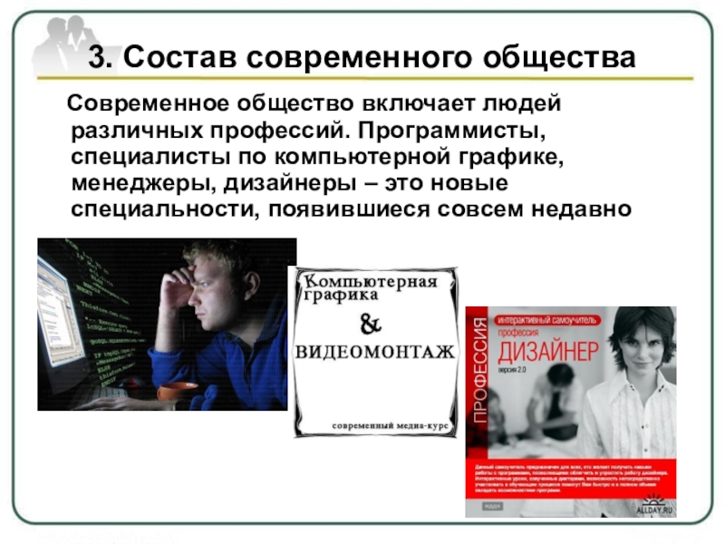 Программисты, специалисты по компьютерной графике, менеджеры, дизайнеры – это новые специальности, появившиеся совсем недавно