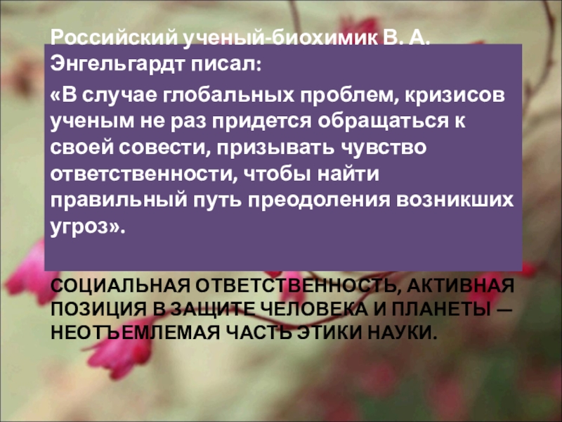 «В случае глобальных проблем, кризисов ученым не раз придется обращаться к своей совести, призывать чувство ответственности, чтобы найти правильный путь преодоления возникших угроз».