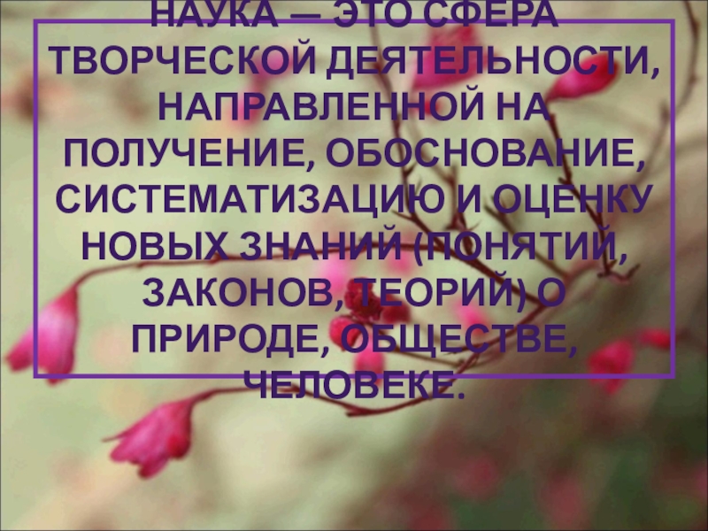 Слайд 2НАУКА — ЭТО СФЕРА ТВОРЧЕСКОЙ ДЕЯТЕЛЬНОСТИ, НАПРАВЛЕННОЙ НА ПОЛУЧЕНИЕ, ОБОСНОВАНИЕ, СИСТЕМАТИЗАЦИЮ
