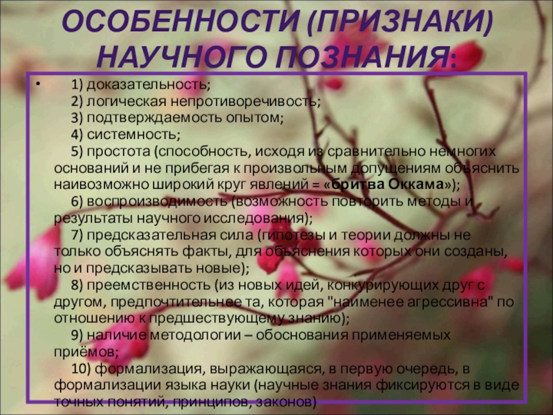 Слайд 13ОСОБЕННОСТИ (ПРИЗНАКИ) НАУЧНОГО ПОЗНАНИЯ:
