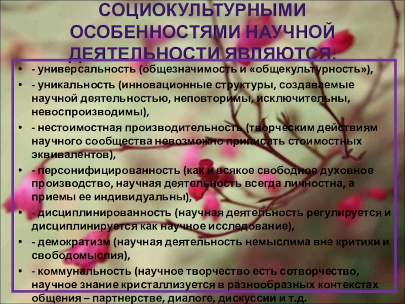 СОЦИОКУЛЬТУРНЫМИ ОСОБЕННОСТЯМИ НАУЧНОЙ ДЕЯТЕЛЬНОСТИ ЯВЛЯЮТСЯ:
