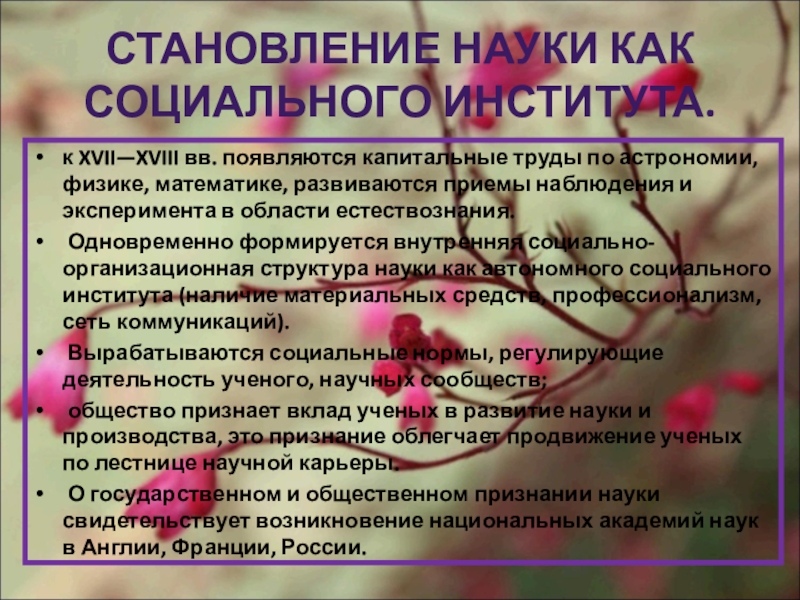 Слайд 7СТАНОВЛЕНИЕ НАУКИ КАК СОЦИАЛЬНОГО ИНСТИТУТА.