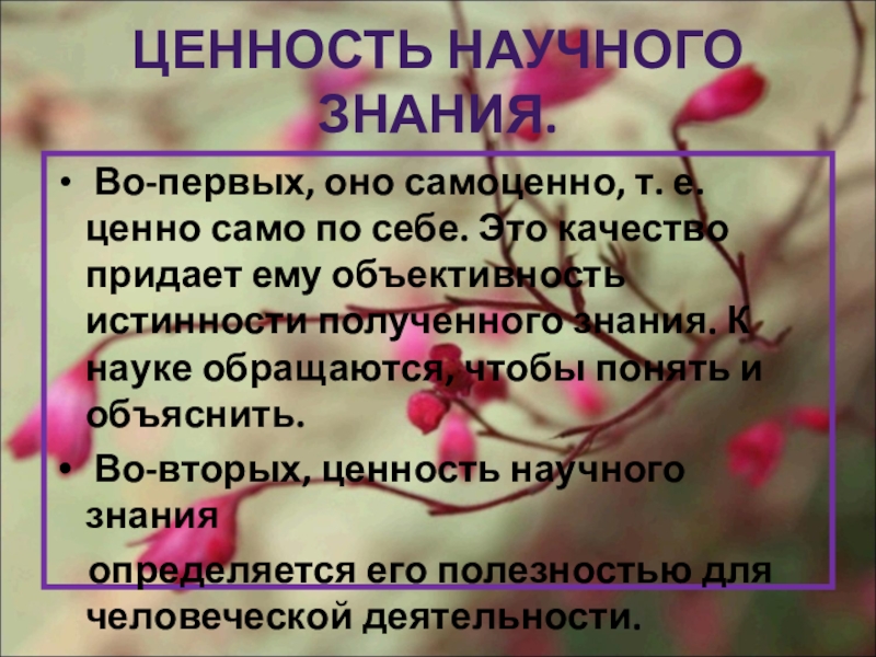 Слайд 4ЦЕННОСТЬ НАУЧНОГО ЗНАНИЯ.