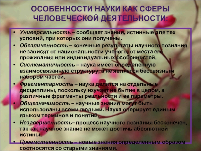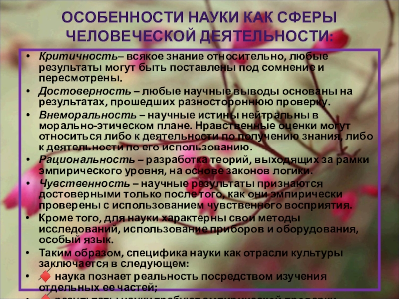 Слайд 10ОСОБЕННОСТИ НАУКИ КАК СФЕРЫ ЧЕЛОВЕЧЕСКОЙ ДЕЯТЕЛЬНОСТИ: