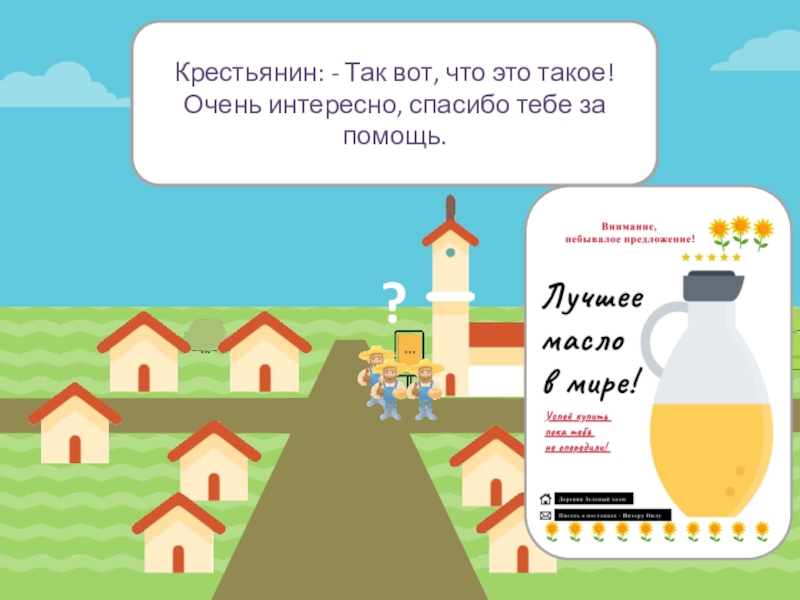 Крестьянин: - И тебе доброго дня. Тут недавно наш торговец маслом поставил на площади стенд. На нем повесил такую картину. Не подскажешь нам, что это такое и зачем?