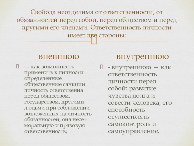 — как возможность применить к личности определенные общественные санкции: личность ответственна перед обществом, государством, другими людьми при соблюдении возложенных на личность обязанностей, она несет моральную и правовую ответственность;