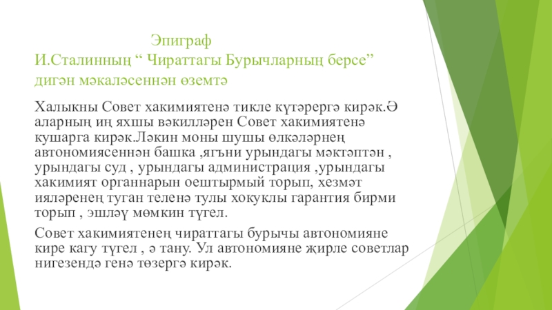 Халыкны Совет хакимиятенә тикле күтәрергә кирәк.Ә аларның иң яхшы вәкилләрен Совет хакимиятенә кушарга кирәк.Ләкин моны шушы өлкәләрнең автономиясеннән башка ,ягъни урындагы мәктәптән , урындагы суд , урындагы администрация ,урындагы хакимият органнарын оештырмый торып, хезмәт ияләренең туган теленә тулы хокуклы гарантия бирми торып , эшләү мөмкин түгел.