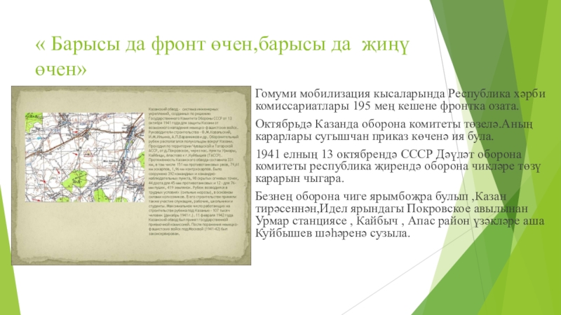 Безнең оборона чиге ярымбоҗра булып ,Казан тирәсеннән,Идел ярындагы Покровское авылынан Урмар станциясе , Кайбыч , Апас район үзәкләре аша Куйбышев шәһәренә сузыла.