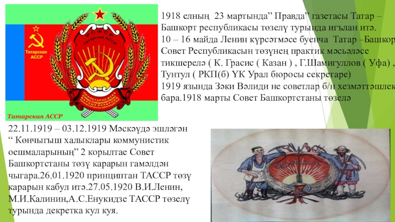 22.11.1919 – 03.12.1919 Мәскәүдә эшләгән “ Көнчыгыш халыклары коммунистик оешмаларының” 2 корылтае Совет Башкортстаны төзү карарын гамәлдән чыгара.26.01.1920 принциптан ТАССР төзү карарын кабул итә.27.05.1920 В.И.Ленин, М.И.Калинин,А.С.Енукидзе ТАССР төзелү турында декретка кул куя.