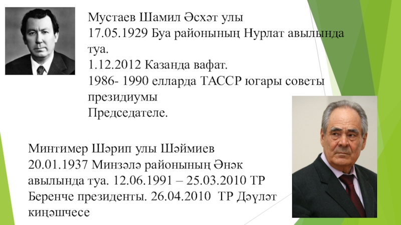 20.01.1937 Минзәлә районының Әнәк авылында туа. 12.06.1991 – 25.03.2010 ТР Беренче президенты. 26.04.2010 ТР Дәүләт киңәшчесе