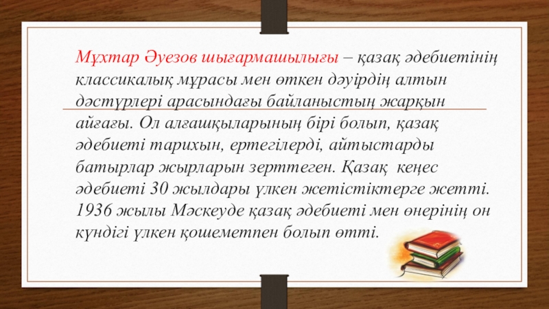 Слайд 4Мұхтар Әуезов шығармашылығы – қазақ әдебиетінің классикалық мұрасы мен өткен дәуірдің