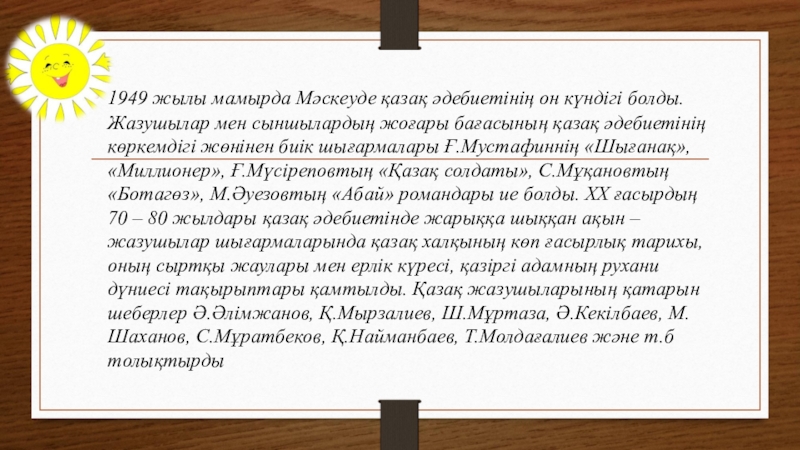Слайд 51949 жылы мамырда Мәскеуде қазақ әдебиетінің он күндігі болды. Жазушылар мен