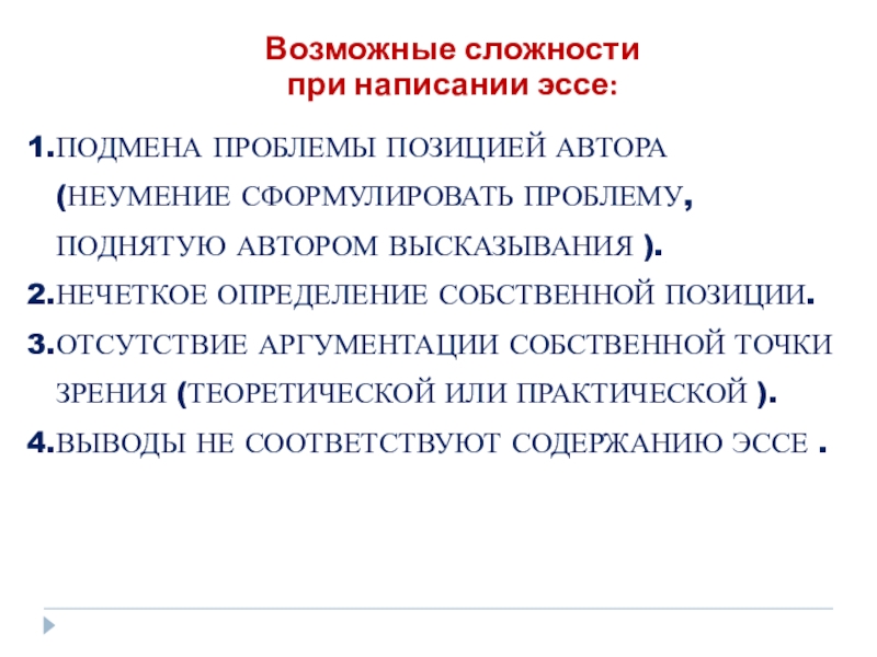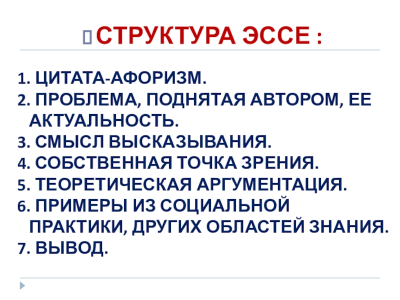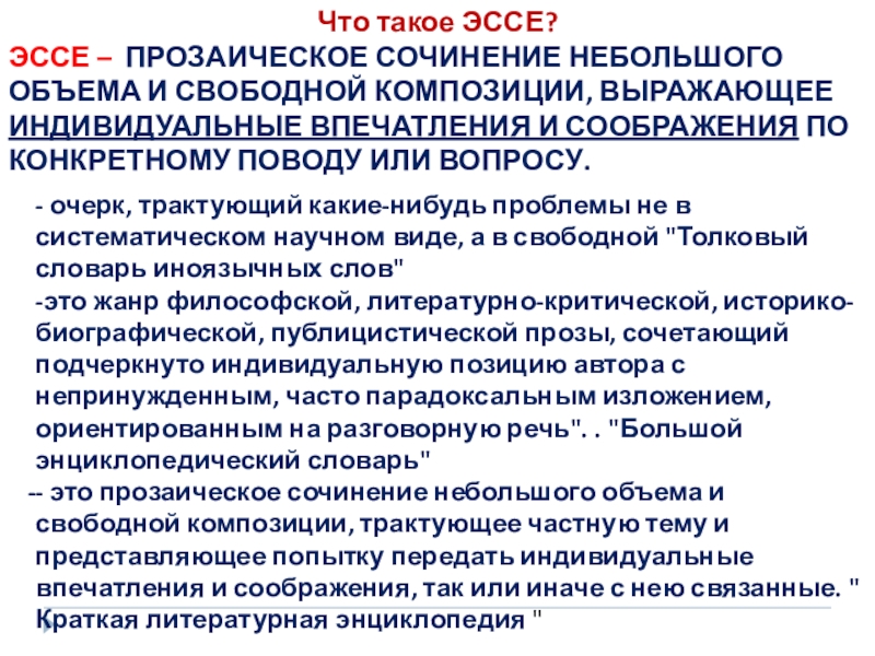 -это жанр философской, литературно-критической, историко-биографической, публицистической прозы, сочетающий подчеркнуто индивидуальную позицию автора с непринужденным, часто парадоксальным изложением, ориентированным на разговорную речь". . "Большой энциклопедический словарь"