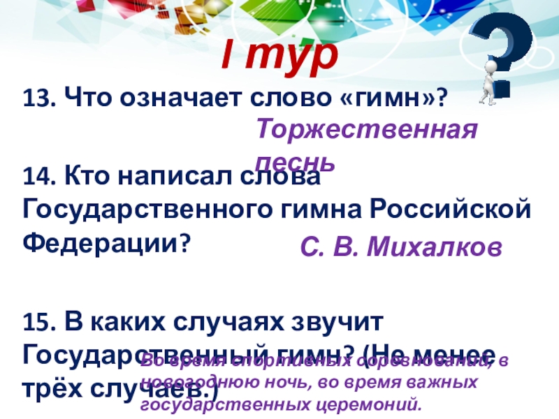 Во время спортивных соревнований, в новогоднюю ночь, во время важных государственных церемоний.