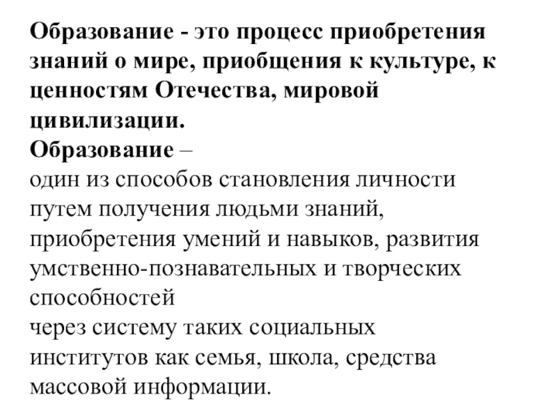 один из способов становления личности путем получения людьми знаний, приобретения умений и навыков, развития умственно-познавательных и творческих способностей